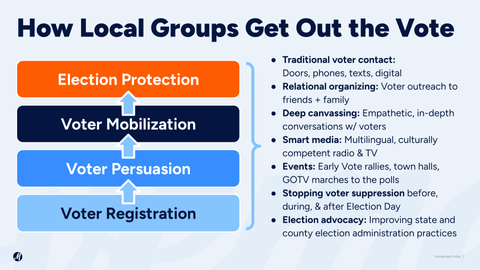 MVP funds year-round, on-the-ground organizing because Election Day is just an inflection point, not the endpoint, in the long arc of social change. By giving today, you are supporting the most effective organizing groups in the most critical places to win on Election Day, ensure every vote counts, and build the lasting power we need to enact transformative policy progress.