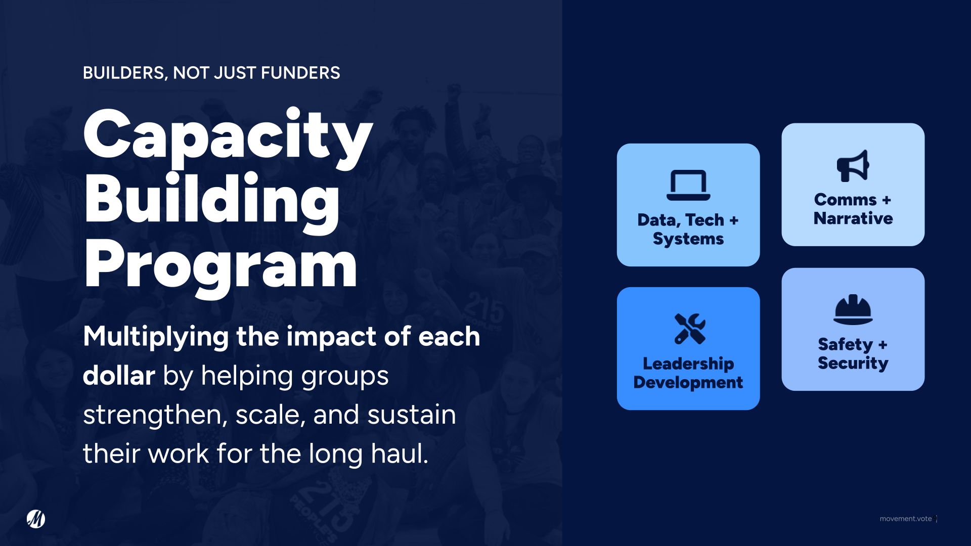 - Safety and Security: In the face of growing threats to on-the-ground organizers’ safety and security, we offer both proactive planning and rapid response support around political violence, hacking, infiltration, and more.