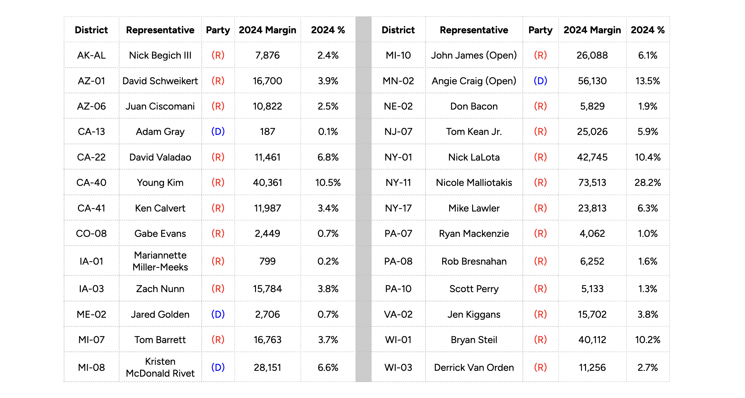 MVP is targeting 26 districts held by members who are A) electorally vulnerable and B) likely to face constituent anger due to MAGA bills. Our targeting reflects past election results, current developments, the 2028 Presidential map, and the presence of well-positioned local partners.
